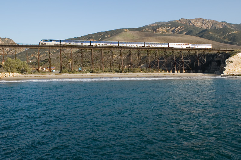 Amtrak's morning Surfliner from San Luis Obispo crosses over the Gaviota Trestle on its way to Goleta and points south.