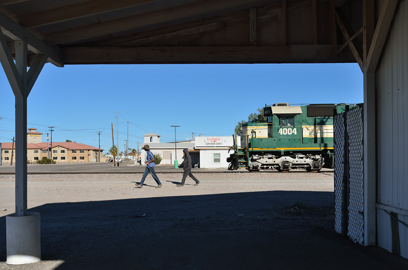 Two local youths stroll past as Arizona & California train number 708 rearranges its power in the yard at Parker. Shortly the train will depart heading west to Cadiz, CA where it will interchange its train with the BNSF.