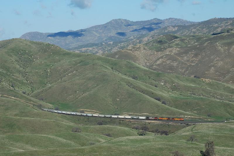 A trio of BNSF Dash-9s holds back a long northbound manifest train as it slowly winds its way down grade between Bealville and Caliente on Tehachapi Pass.