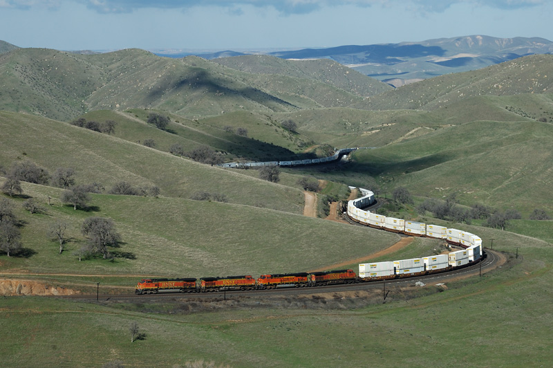 Four BNSF GEs lead a southbound Z train through the curves of Bealville as they work their way up the north slope of Tehachapi Pass.