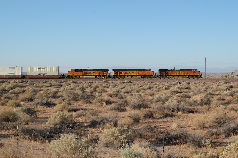 A hot Bay Area bound Z train races across the Mojave desert floor just west of Silt on the BNSF Mojave Sub.