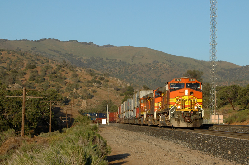 The sun sheds its final light of the day on a BNSF stack train as it enters Woodford siding.