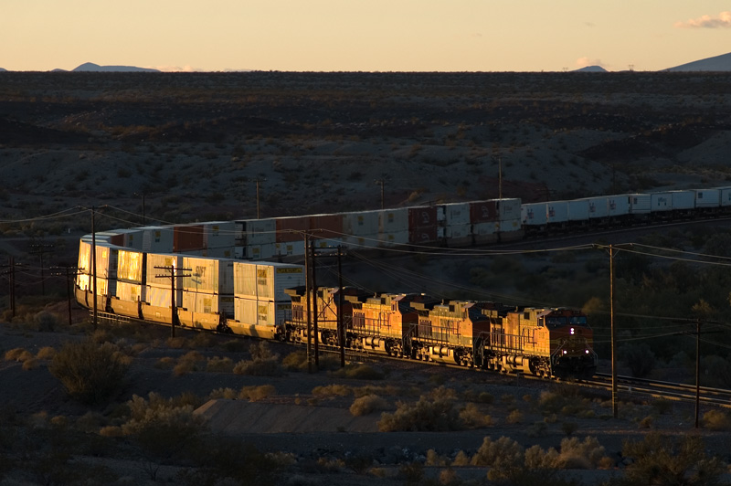 After having been held for a work window and several westbounds, an east bound stack train makes its way around a large curve between Klinefelter and Java as the sun sinks low in the sky.