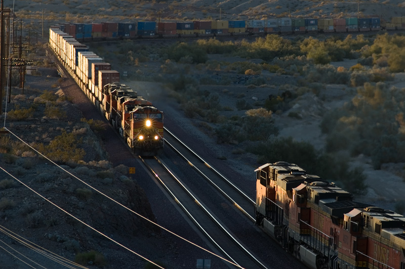 Rush hour on the Needles Sub. Track maintainers have had been working on a section of track on the west side of Goffs Hill, and the resulting single track section has created quite the traffic jam to the west of Needles. Here an eastbound and westbound roll past each other shortly after the maintainers have reopened the second track.