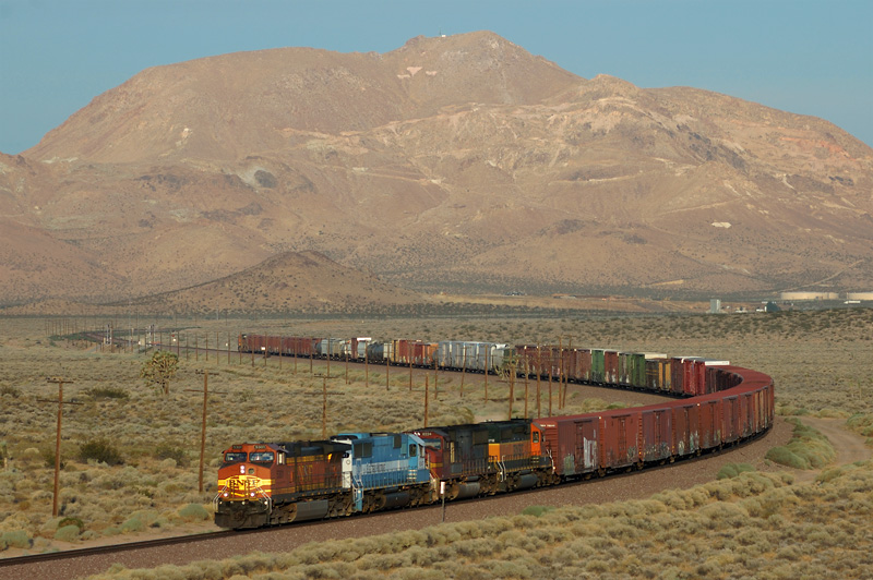 The sun has just poked its way through a cloud bank and sheds light and warmth on the Mojave desert. A southbound BNSF manifest with a colorful mix of power up front and on the rear has just departed Sanborn siding as it makes its way towards Barstow on the BNSF Mojave Subdivision.