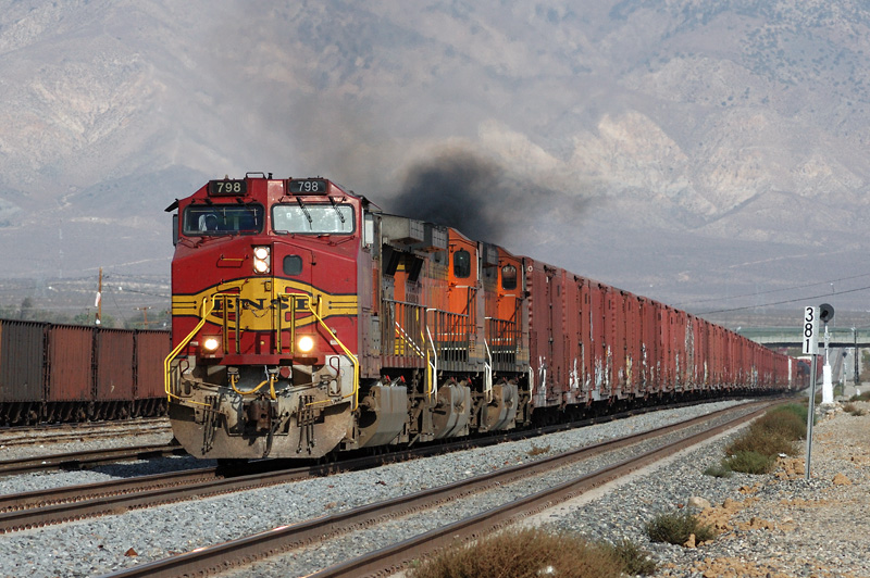 A BNSF manifest lead by three Dash-9s passes south through Mojave on its way to Barstow.