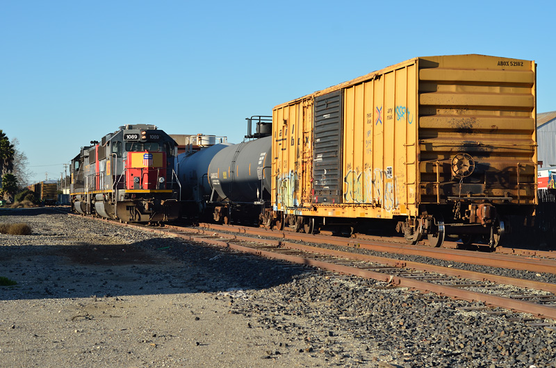 The power for the Hollister local run around a cut of cars as they rearrange their train to switch San Benito Foods.