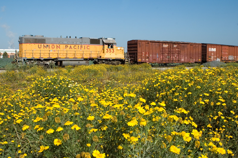 The Oxnard Local lead by GP38-2 number 353 pulls it's train of empties out from the Proctor & Gamble plant past a field left to fallow where some flowers seem to have prospered.