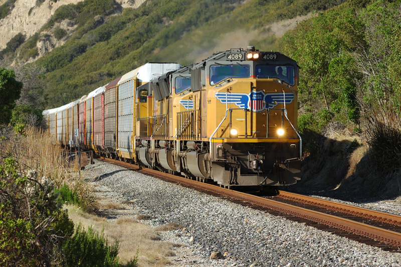 A southbound auto racks train from Milpitas California to Nogales Arizona approaches Sea Cliff siding on the Santa Barbara Sub.