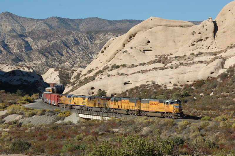 A Fresno to West Colton manifest passes the Mormon Rocks as it makes its way down the old Southern Pacific Palmdale Cutoff on Cajon Pass.
