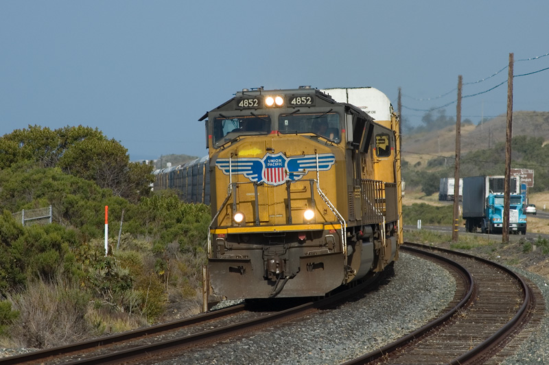 In the early morning, a southbound auto racks train rounds a curve as it passes through Capitan.