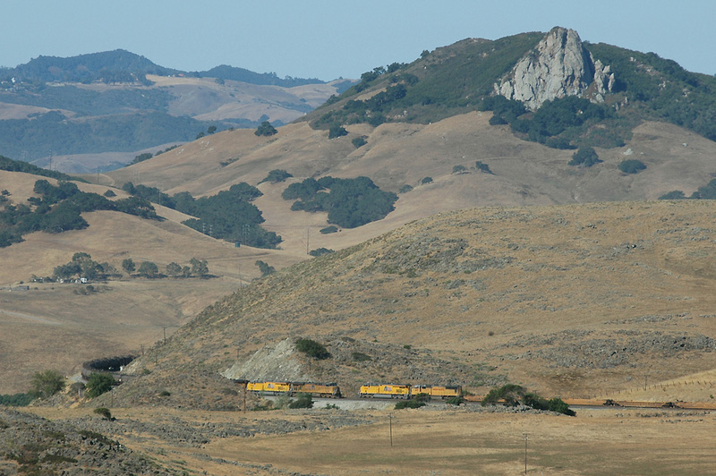 The northbound oilcans and a southbound baretables train meet at Chorro siding on Cuesta Grade.