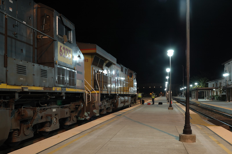 The southbound Oil Cans has stopped in San Luis Obispo breifly for a crew change before continuing down the Coast Line under the cover of darkness.