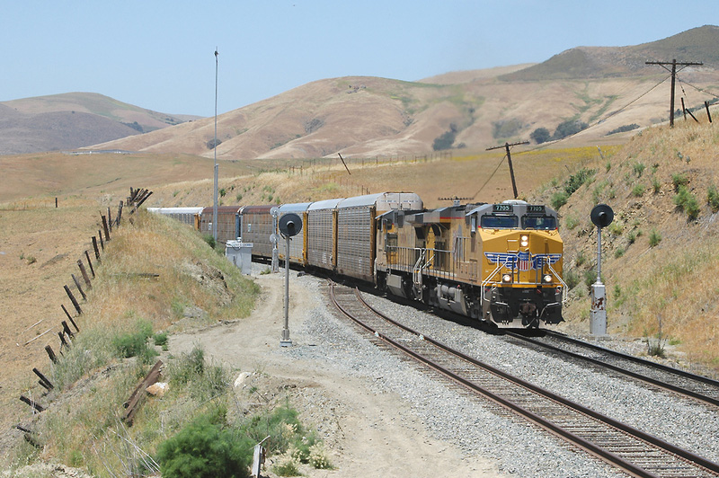 A midday northbound auto train passes through the targets into Chorro siding on Cuesta Grade.