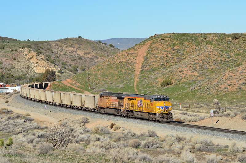 The Vulcan Rock, now with UP 7991 in the lead, is working hard on its climb up Vincent Hill. Once the train has crested the grade at Vincent it will be down hill running all the way to its destination of Sun Valley.
