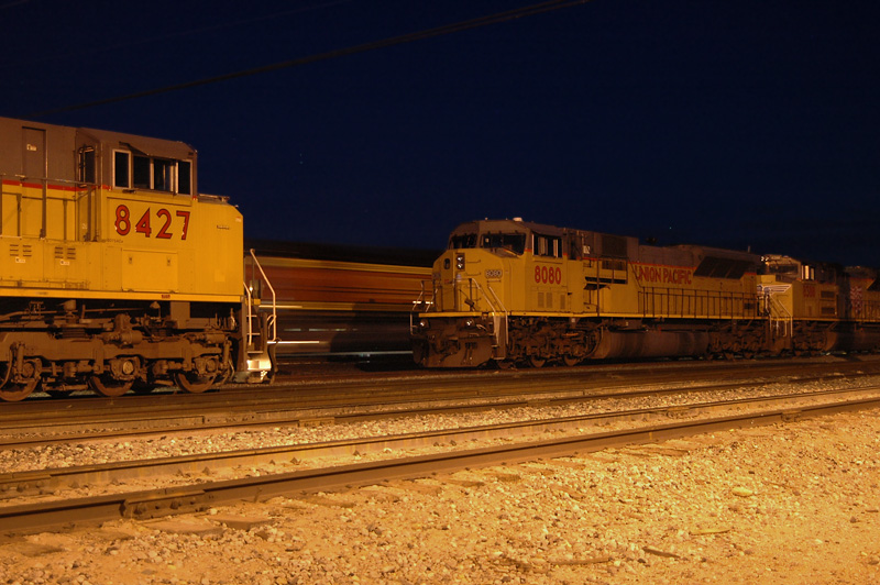 Union Pacific road power idles in the Mojave Yard as a southbound BNSF Z train passes by.