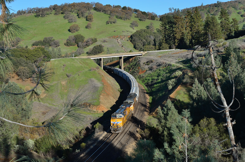 A rather short Union Pacific North Platte to Roseville manifest makes its way downgrade between James and Elsey along the edge of the Sierra foothills. Here it passes under Highway 70, which has been its constant companion through the Feather River Canyon, and will continue to be till just south of Marysville.