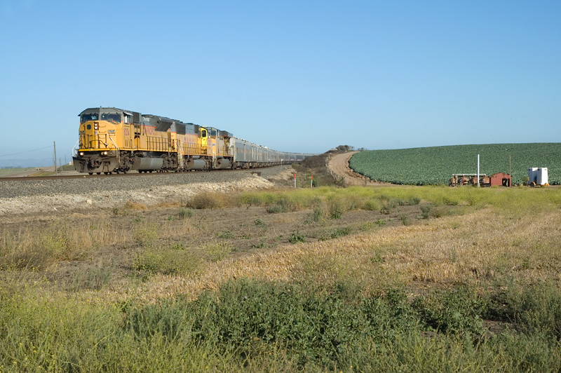 The Ringling Bros. and Barnum & Baley circus train passes through fields in the fertile Santa Maria Valley as it works its way north on the UP Santa Barbara Sub. The circus train ran from Kaiser California after their show in Ontario California, to San Jose California to set up for their show there. Instead of being routed over Tehachapi and the Valley Line, UP routed the train up the Coast Line, something that last happened in 1995.