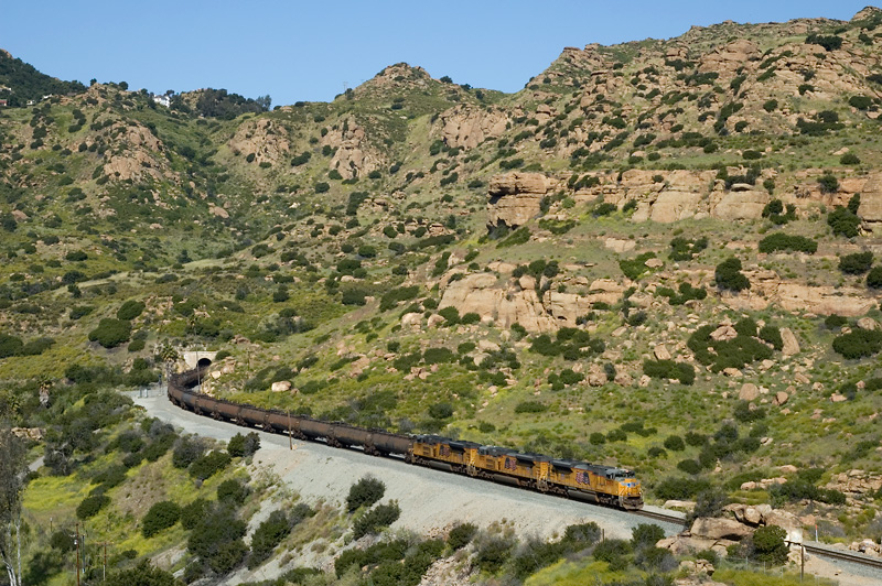 After having been delayed by several commuter trains, the loaded oil cans make their way down Santa Susana Pass and into the San Fernando Valley on their way to Dolores.
