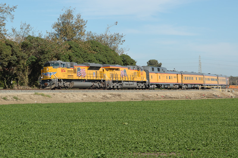 A UP passenger special from Houston, TX passes by fields on the south end of Ventura on its way north.