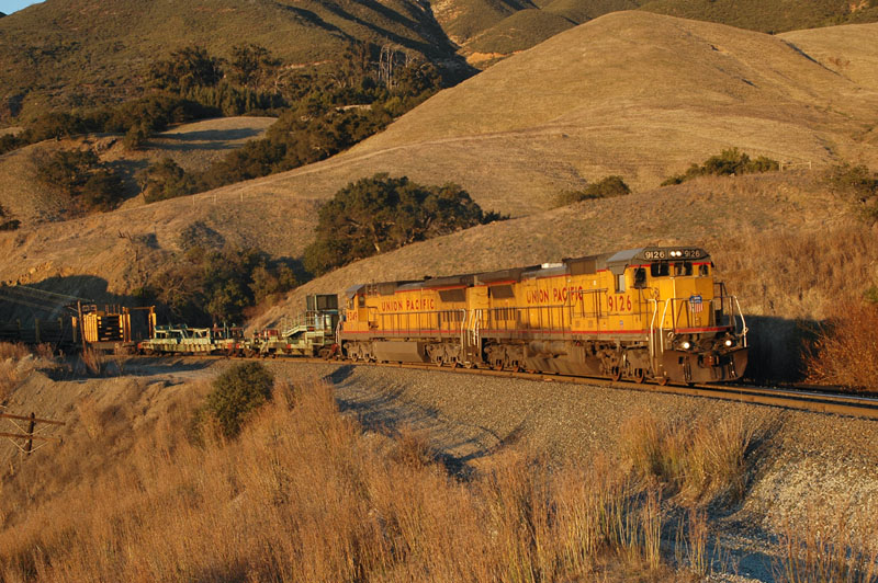 A northbound welded rail train emerges from the smaller horseshoe curve just railroad south or South Serrano.