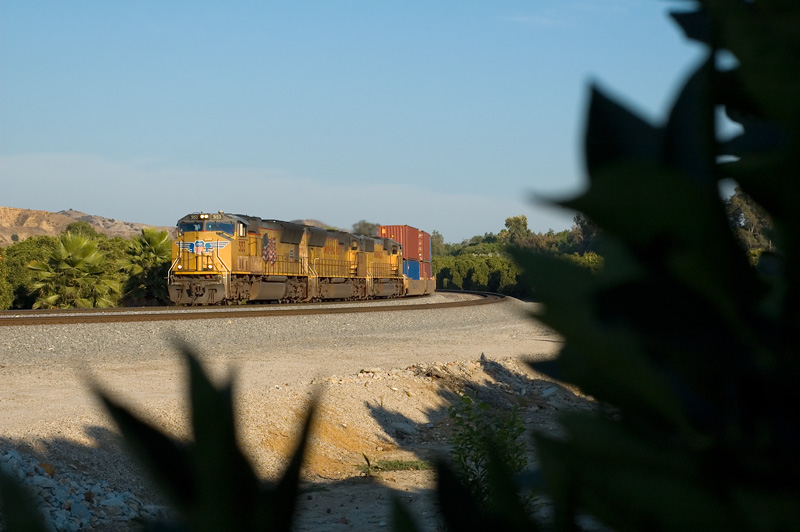 A trip of SD70Ms with a westbound double stack train drifts down hill through orange groves on the western face of Beaumont Hill.