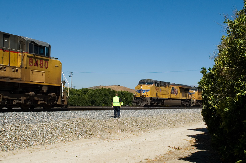 The conductor of a westbound stacker that is waiting at Ordway inspects an eastbound as it makes its way through the crossover and up the hill.