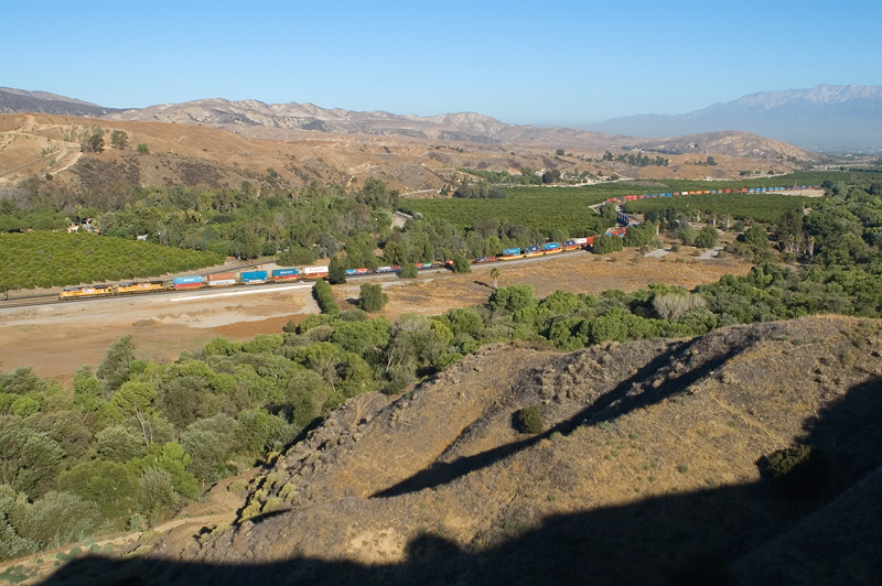 An eastbound stack train works its way up grade through the orange groves in the lower portions of San Timoteo Canyon.