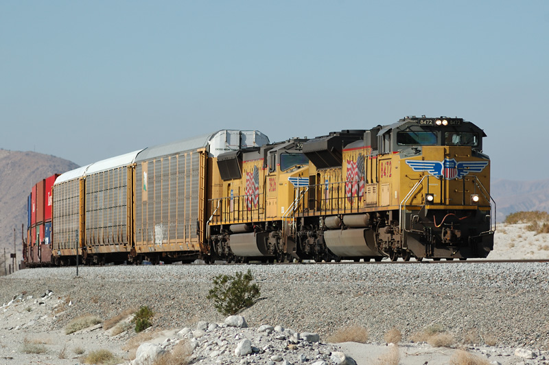 An stack train headed for Dupo, IL rounds a curve on its way down the east side of Beaumont Hill. It has just passed through West Palm Springs, and has many more miles of desert running before its trip east is over.